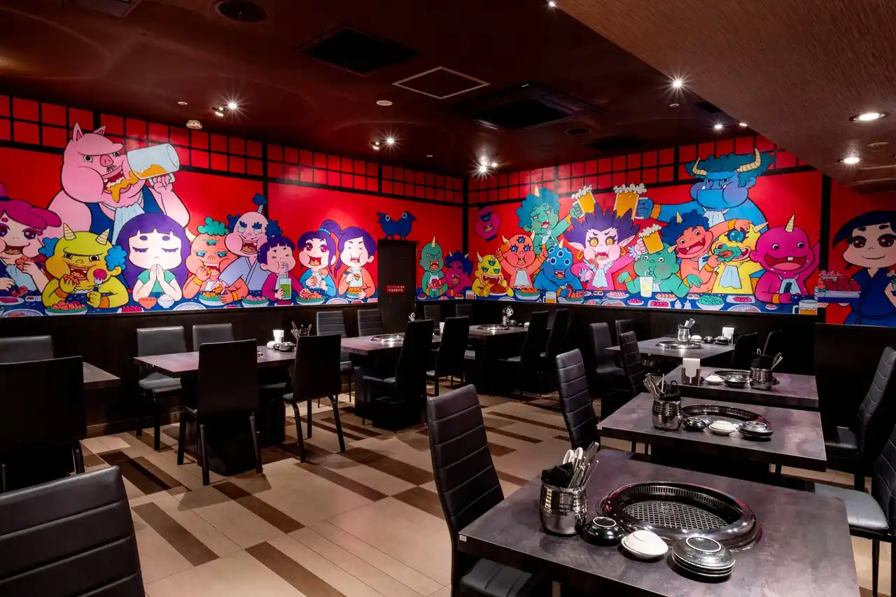 店内は主に2種類の異なる雰囲気のお席をご用意。掘りごたつ式の和モダン空間では、木のぬくもりと黒を基調としたシックな内装が、食事に集中できる落ち着いた雰囲気を演出。テーブル席エリアには、カラフルなポップアートが壁一面に描かれた個性的な空間も。赤を基調とした明るい雰囲気で、グループでのにぎやかな食事会にもぴったりです。 |