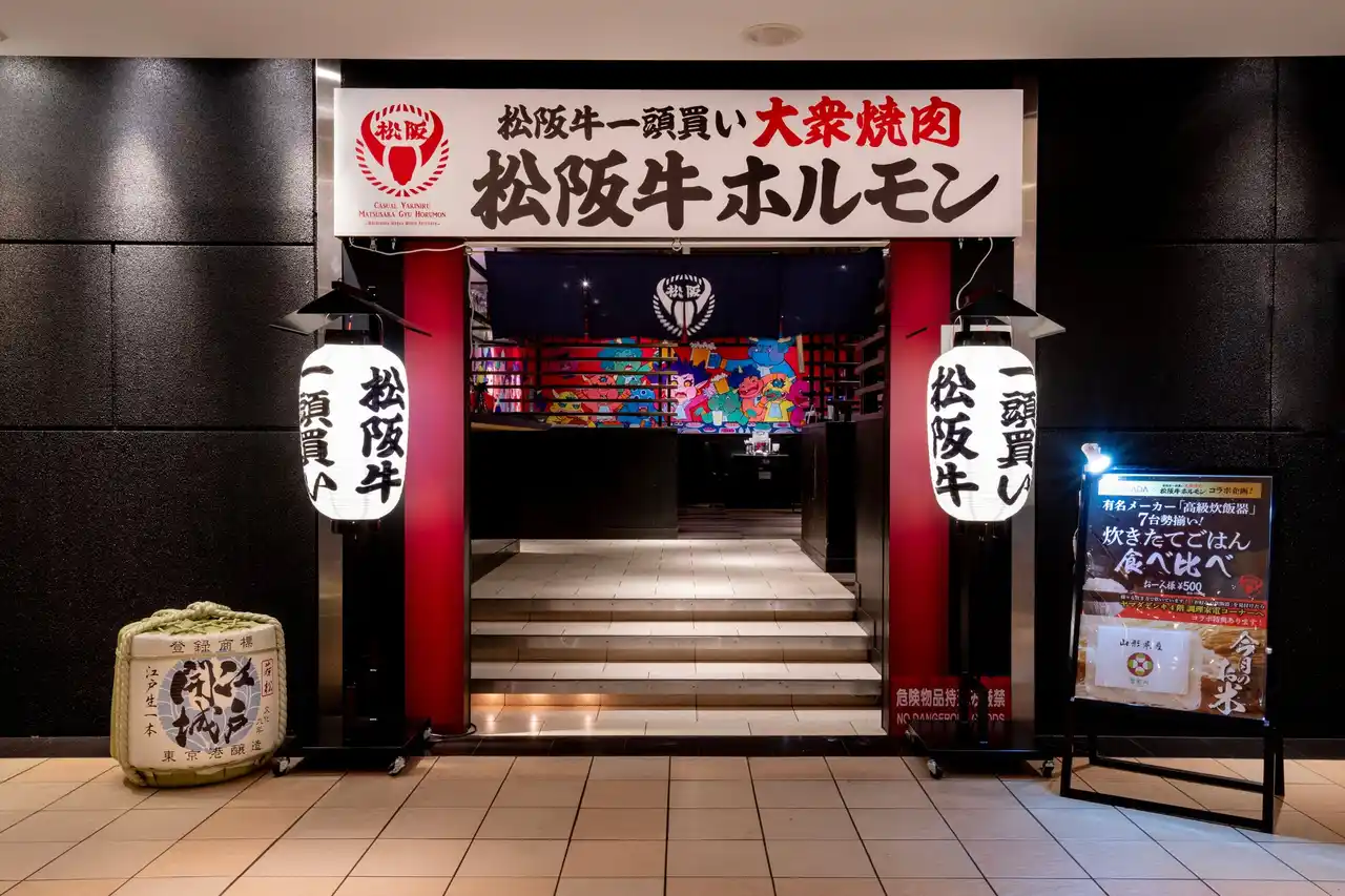 池袋駅徒歩1分、ヤマダデンキLABI7階に位置する「松阪牛一頭買い 大衆焼肉 松阪牛ホルモン」は、和の趣を現代的にアレンジした落ち着きある空間です。店舗入口は提灯と看板が掲げられ、松阪牛専門店の風格を感じさせます。 |