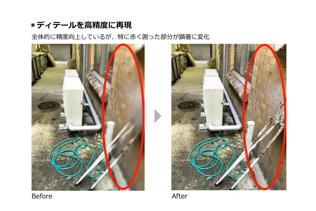 一方で課題もあり、ガウシアン・スプラッティングによる3Dデータの再構築は、ガス状のデータ表現のため、見た目は綺麗でも形が不正確で、別視点から見ると形が崩れる課題がありました。また、ガウシアン・スプラッティングは入力データが適切に揃えばディテールを綺麗に再現可能なものの、逆に逆に撮影範囲や撮影距離が適切でなければディテールが十分に再現されないという課題もありました。 |