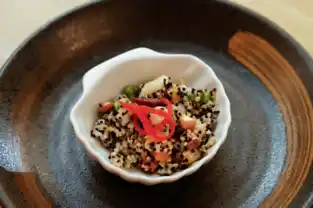 高い栄養価を誇るアンデス原産のキヌアをベースに、伝統的なタブレをアレンジしたフレッシュでヘルシーなサラダです。新鮮な野菜と香り高いハーブを合わせ、レモンベースの爽やかなドレッシングで仕上げています。健康的で美味しい一品です。 |