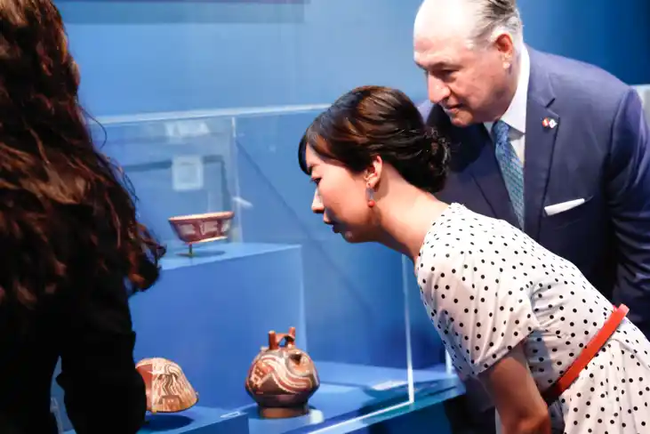 歴史的に貴重なナスカの文化財をご覧になる佳子さま、隣はロベルト・セミナリオ駐日ペルー共和国特命全権大使 |