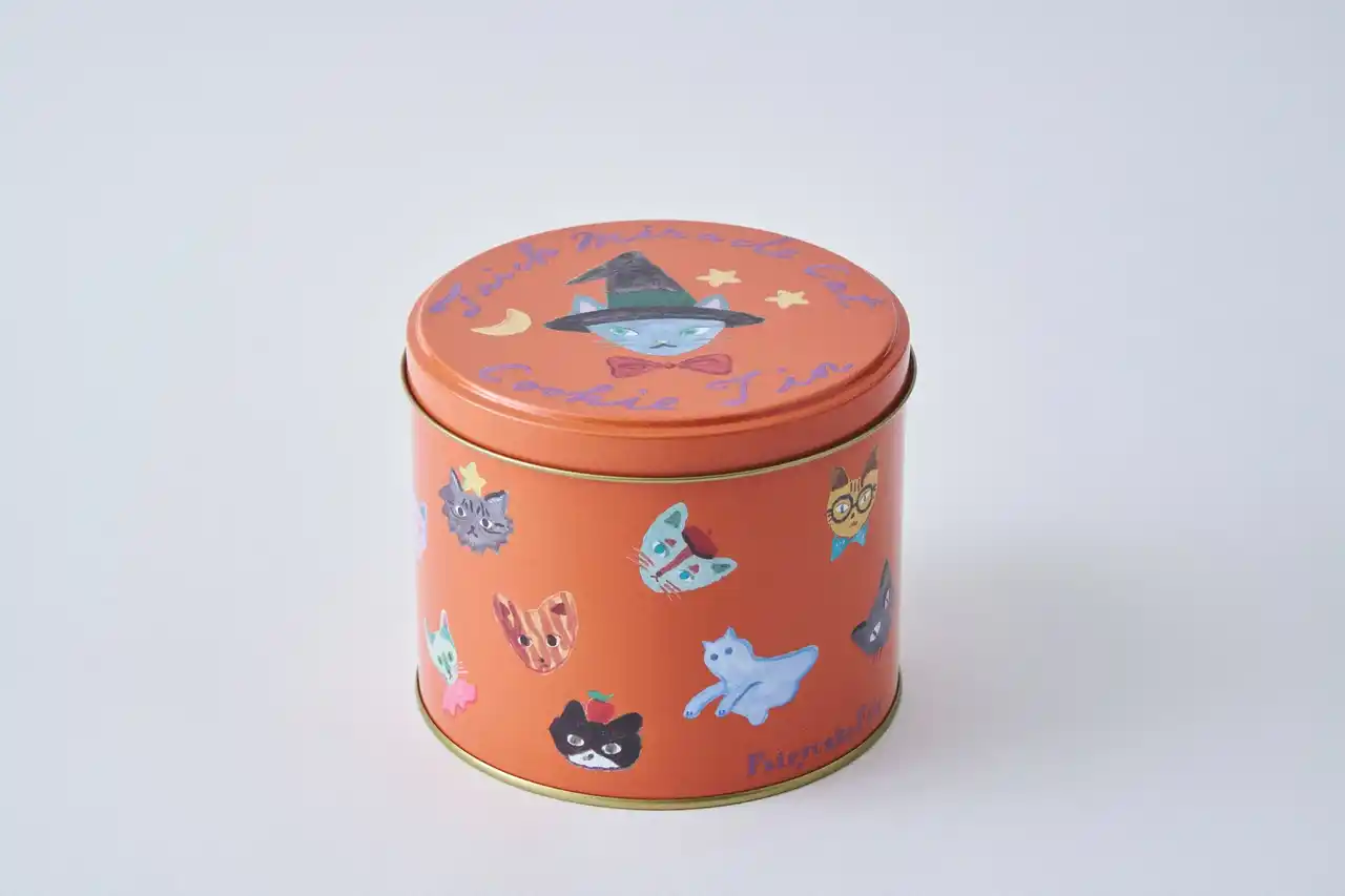 ハロウィンカラーのパンプキンオレンジに包まれた缶には、かぼちゃ・フランケンシュタイン・オオカミを思わせる表情豊かなネコたちが大集合!イラストは、本シリーズでおなじみのイラストレーター・前田ひさえさんが描き下ろしました。缶の側面には、まるで“ネコたちのハロウィン夜会”をのぞき見するような世界がぐるりと広がり、360度どこから見ても楽しめる仕掛けとネコクッキーがぎっしり。ハロウィンらしい遊び心のあるクッキー缶に仕上がっています。 |