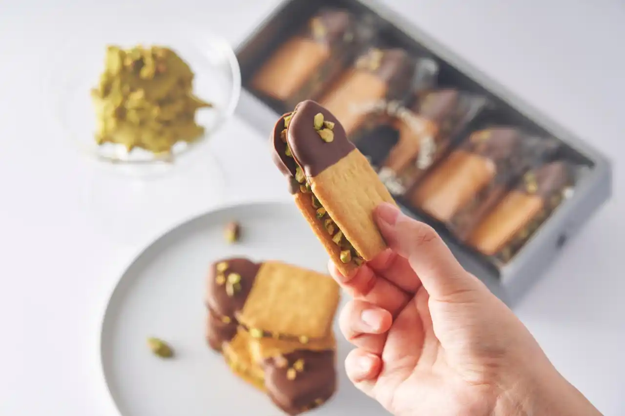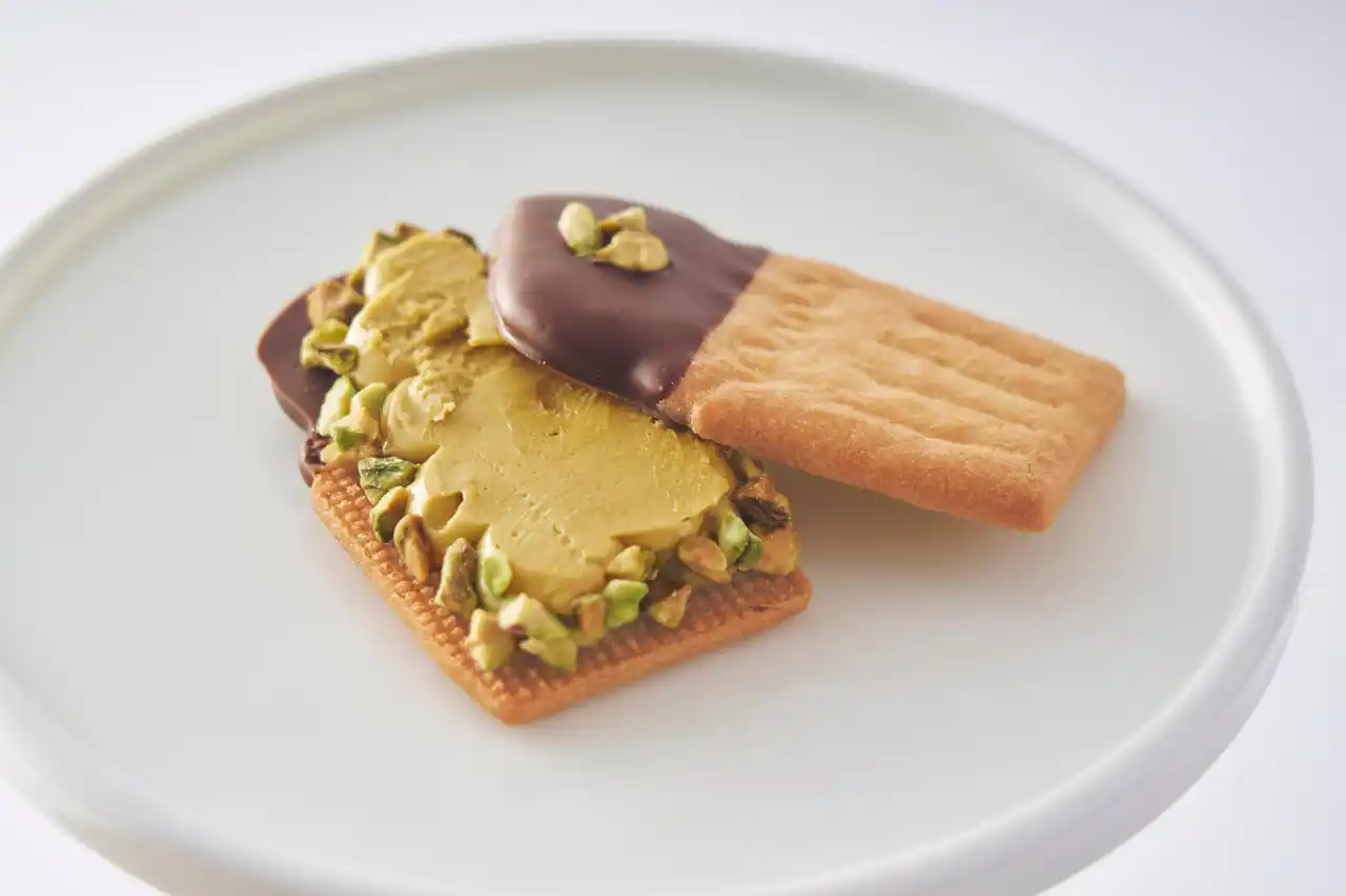 毎年大好評の「ピスタチオ生バターサンド」が、今年も秋季限定で登場。 イタリア産ピスタチオペーストを贅沢に使った生バタークリームを、香ばしく焼き上げたビスケットでサンド。表面にはミルクチョコをかけ、砕いたピスタチオナッツをトッピング。まろやかな風味とサクッとした食感が織りなす、ピスタチオ尽くしの贅沢スイーツです。 |