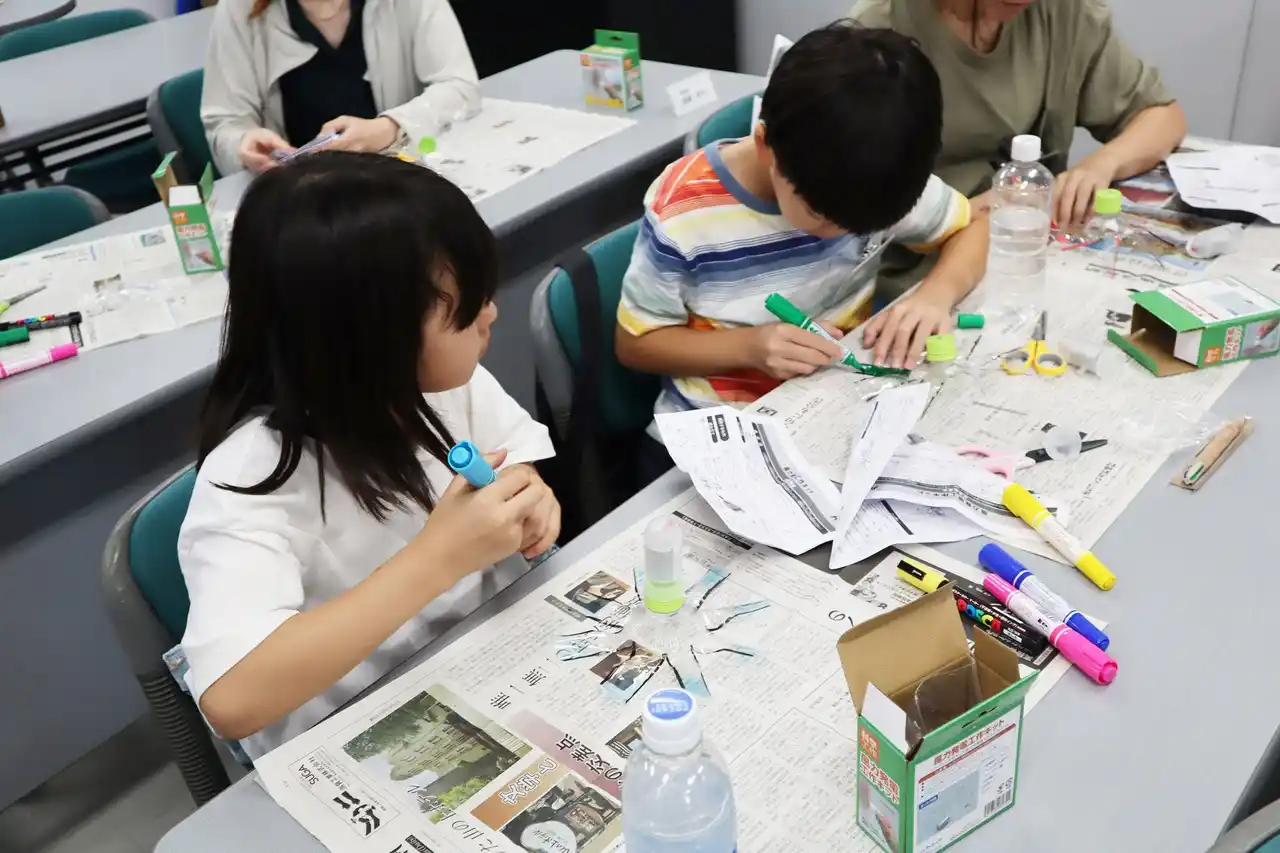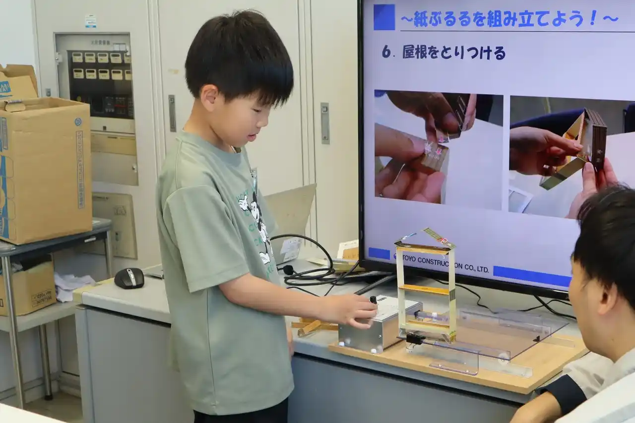 | 地震の仕組みを学んだ後、地震に強い構造を知ってもらうため、耐震構造が学べる紙工作「紙ぶるる」にチャレンジしました。子どもたちは紙工作の家に筋交いを入れた場合の耐震や基礎下に丸棒を挿入した制振補強を実感していました。 | |||||||||