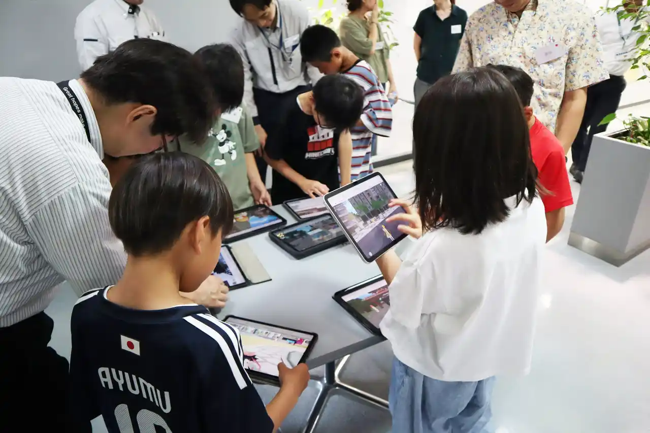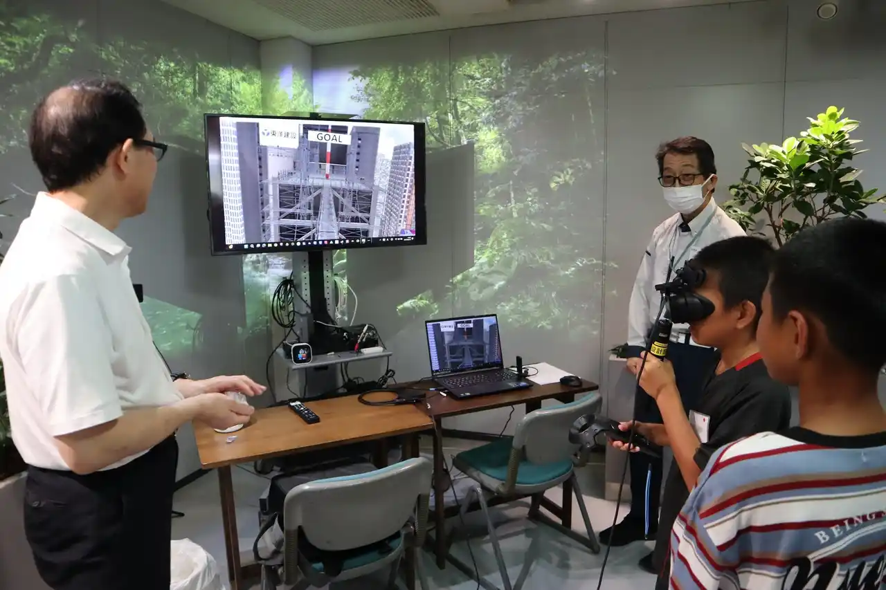 | 【VRってなに!?】は、今年から新たに取り入れた体験学習です。VRゴーグルやタッチパネルによってメタバース空間に再現された工事現場の鉄骨の上を歩く体験にチャレンジ。まるで本物の工事現場にいるかのような臨場感に、子どもたちは興味津々の様子でした。楽しく体験しながら工事現場における安全の重要性を学んでもらいました。 | |||||||||