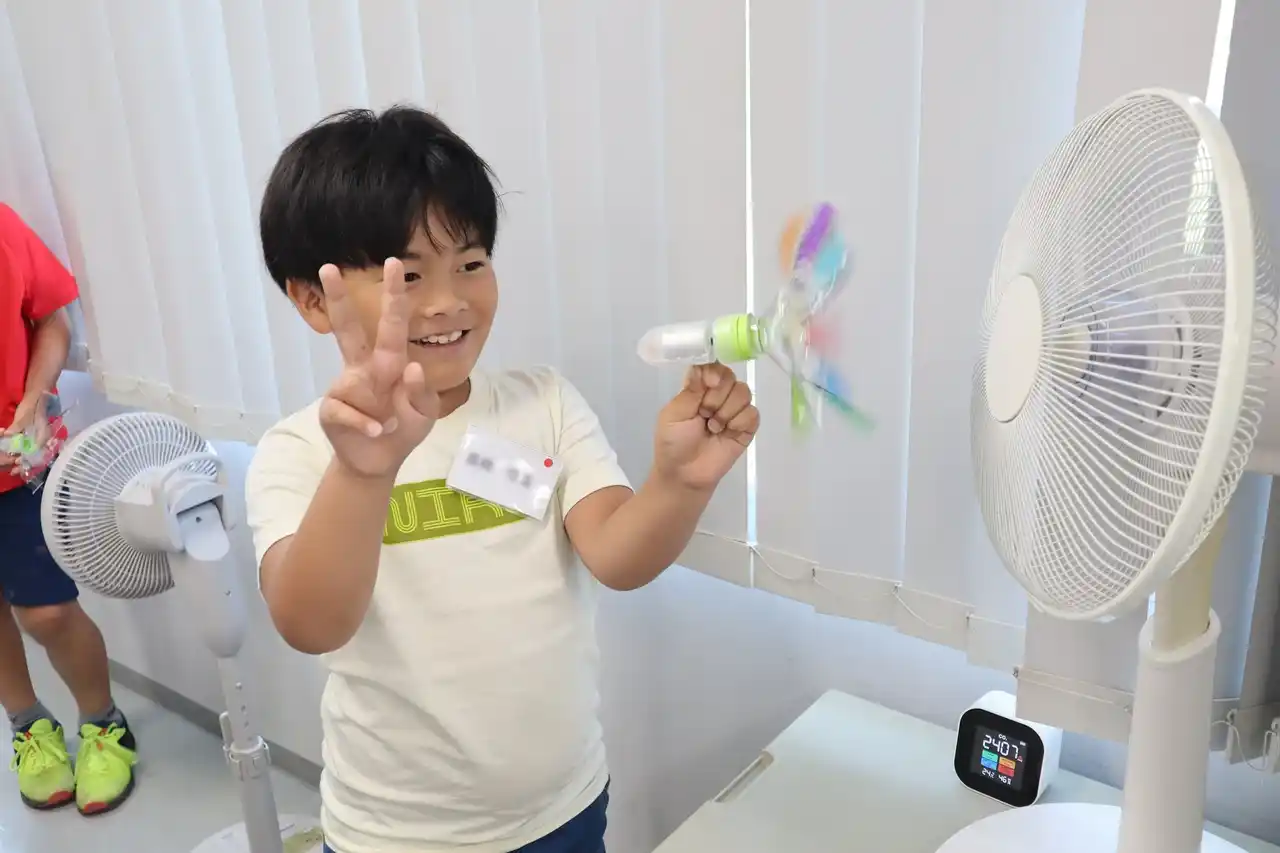 | 再生可能エネルギーのひとつである風力発電の仕組みなどを学習した後に、ペットボトルの風車を作製し、風力発電の仕組みを体験しました。扇風機の前で風を受け、風車の羽が回ることで先端に付けた赤色LEDが発光するのを観察しました。風車の先端が赤く光ると子どもたちは喜び、地球にやさしい自然エネルギーについて手軽な風車を通じて大変興味が湧いた様子でした。 | |||||||||