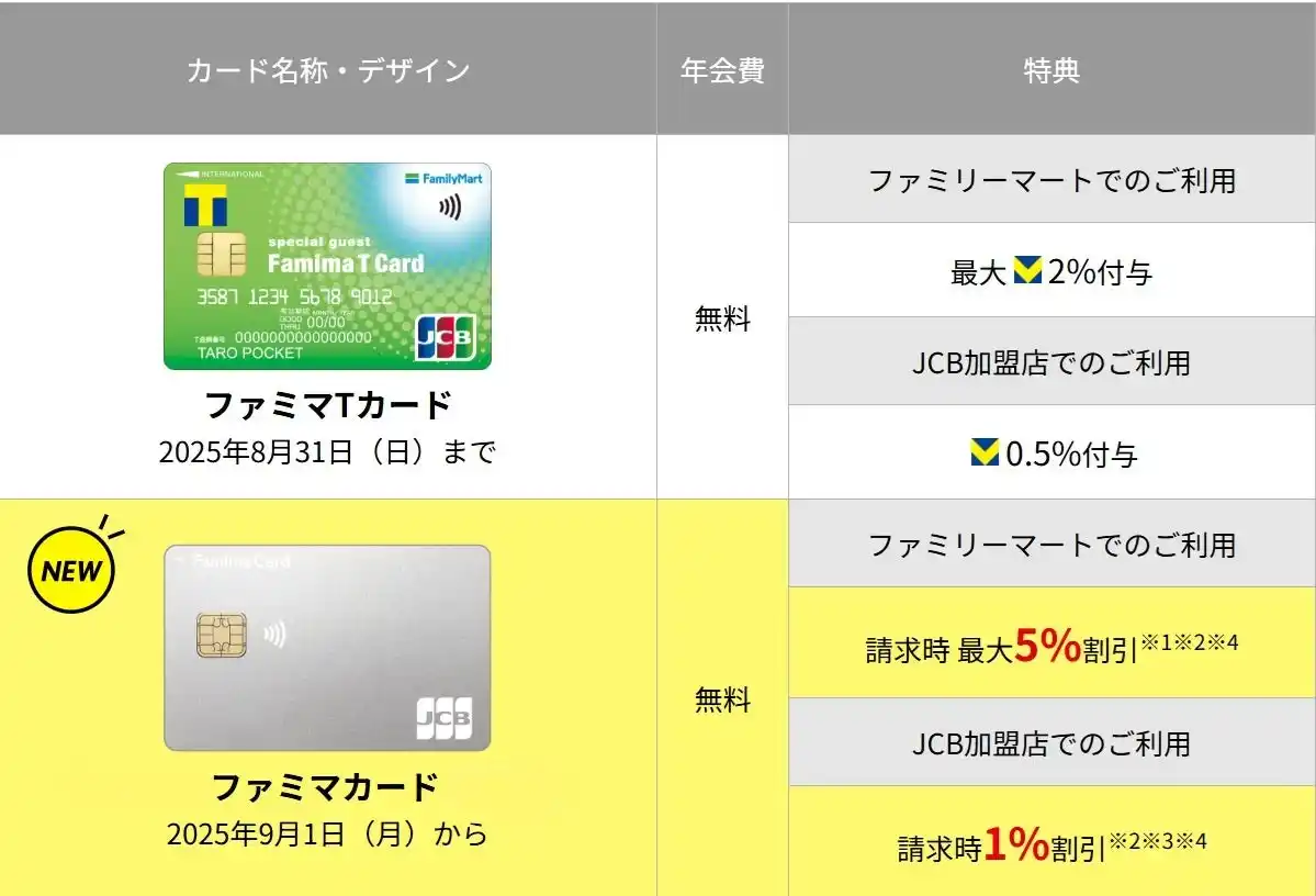 ファミマTカード・ファミマカード 新旧対比表は以下の通りです。 |