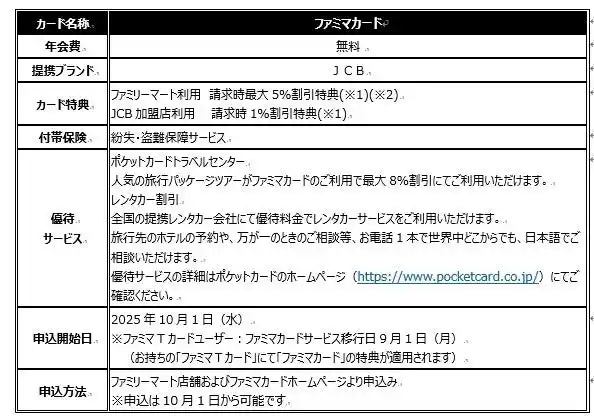 ポケットカード株式会社(本社:東京都港区、代表取締役社長:高垣 晴雄、以下「ポケットカード」)は、「ファミマTカード(クレジットカード・ポイントカード)」の会員サービス終了に伴い、2025年9月1日より「ファミマカード」としてさらにおトクな特典を備えた新カードへリニューアルいたします。