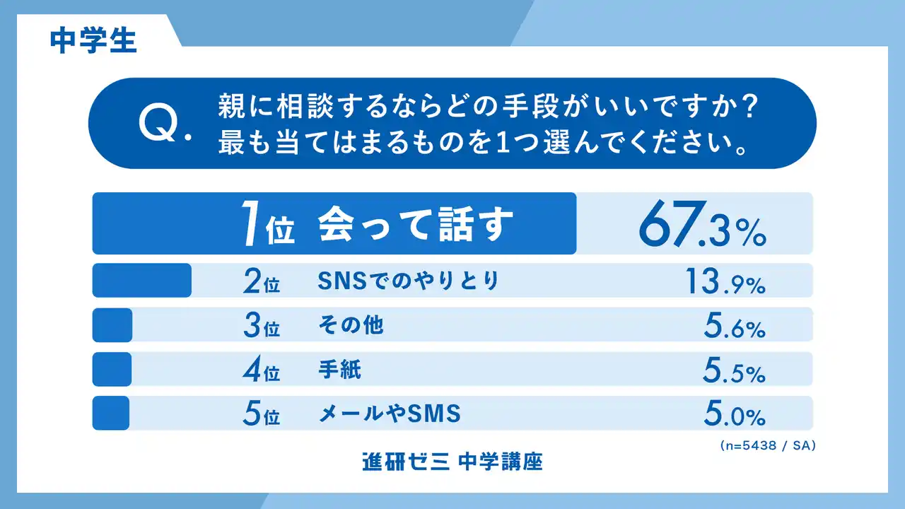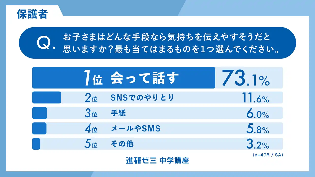 夏休みが終わり、中学生にとっては新学期が始まるこの時期、家庭内での会話は一層大切な役割を果たします。今回の調査からは、親子の双方が「直接会って話す」ことを信頼している一方で、保護者は「工夫や努力」、中学生は「自然な空気」を重視するなど、認識に違いがあることが浮き彫りになりました。 |