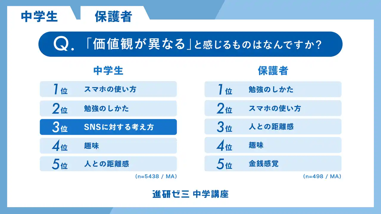次いで中学生は「SNSに対する考え方」、保護者は「人との距離感」 |