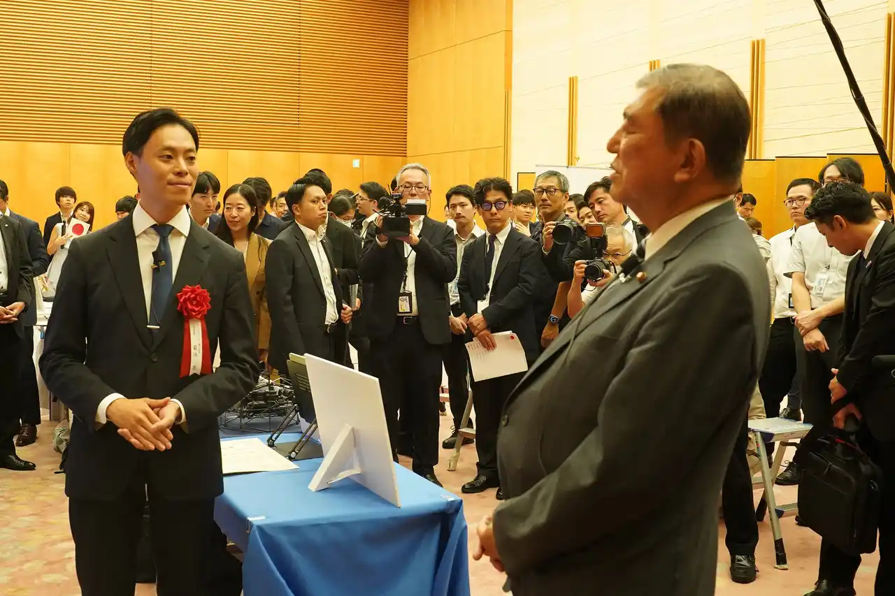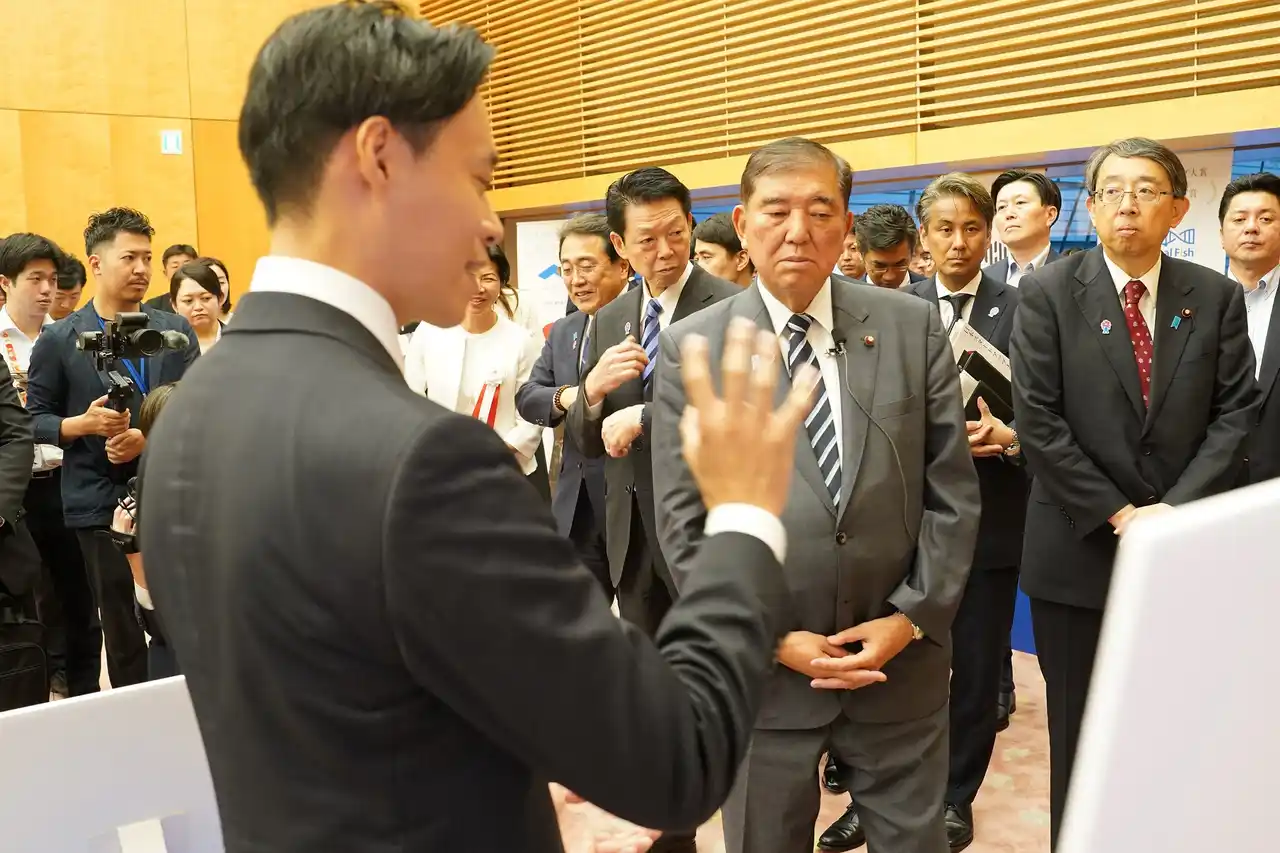 首相官邸にて執り行われた表彰式にて 石破総理による当社ブース視察の様子 (2025年8月26日) |