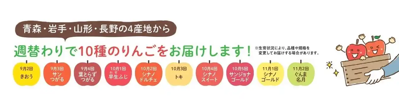 本企画は予約登録すると、約2か月間、毎週定額で1品種2個のりんごが届き、食べ比べを楽しめるという、言わば「りんごのサブスク」です。本企画は昨年スタートし、好評を博したため、今年はお届けするりんごの種類を8品種から10品種へと増やし、よりさまざまな味を楽しめるようになりました。 |