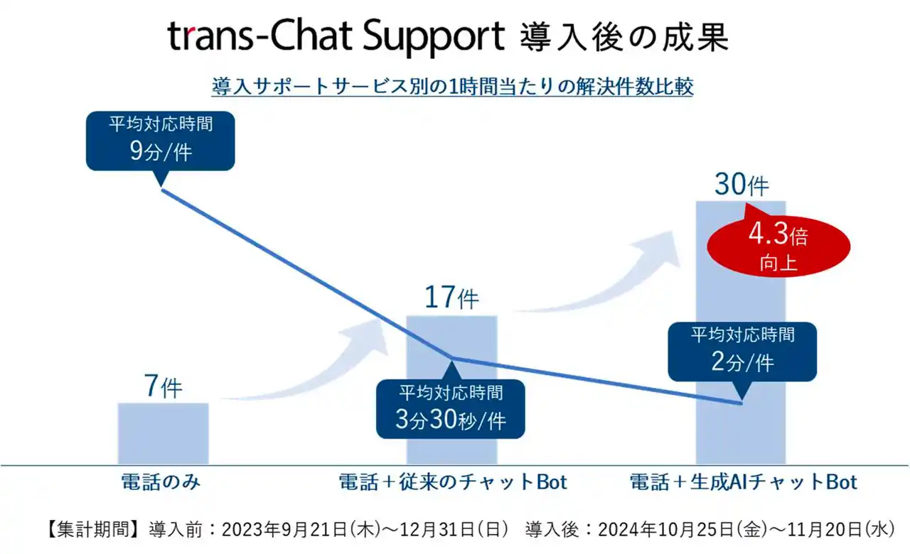 生成AIチャットBotを搭載した「trans-Chat Support」は2024年10月に導入され、1時間当たりの解決件数は電話対応のみに比べ4.3倍に増加、1件当たりの平均対応時間を約7分短縮させることに成功しました。 |