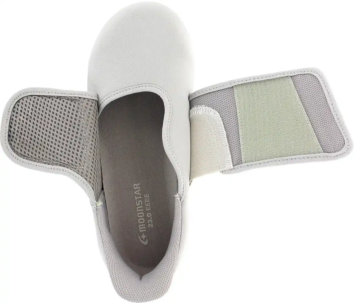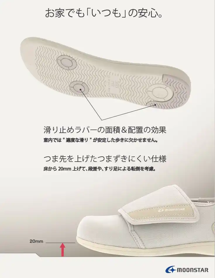 柔らかい素材で足当たりもやさしく、スッと履ける踵形状で脱ぎ履きも簡単。介助する方も楽に履かせることができます。むくみが気になる方でも着脱しやすいように「PASTEL410」は履き口が大きく開き、「PASTEL411」は幅広の甲バンドがゴムなのでよく伸び足にフィットする仕様が特徴です。靴底の滑り止めラバーは室内での利用を考慮した面積と配置に設計され、安定した歩行をサポートします。つま先部分は床から20mm上げており段差やすり足によるつまずき防止の設計。中敷を外してウィズ調整も可能です。さらに軽量性やニュートラルな落ち着いたカラー展開で室内での快適さにもこだわりました。リハビリシーンやお庭やちょっとした外履きにもおすすめです。 |