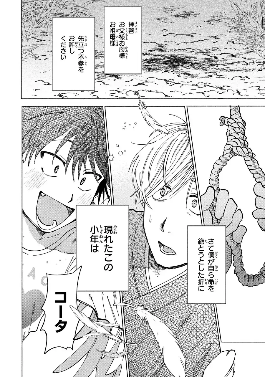 しかしそこに天使ピンちゃんが突如現れ、「コータを生かしに来たんだよ!」と宣言する。コータは死に方を、天使はコータの生き方を模索することに。攻防を繰り広げているふたりが家に帰ってきたところ、強盗事件の埋蔵金小判が庭から発見され――!? |