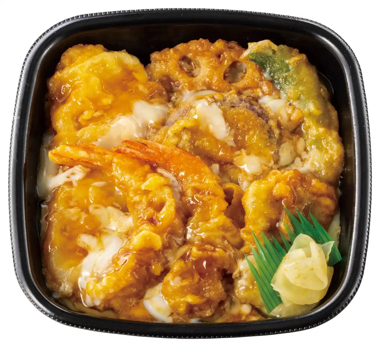 エビ2尾/イカ/カレイ/野菜3種 海鮮天とじ丼 730円 |