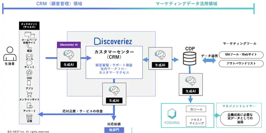 | ジーネクストでは、顧客対応窓口をはじめとした、企業を取り巻くステークホルダーのDXを支援するプラットフォーム「Discoveriez」にて、顧客対応内容を記録し、顧客データの的確な管理を実現しており、対応時間の短縮および顧客データの正確な管理をも取られる一方、人材不足といった大きな課題解決が顕在化しており、加えてこれらの課題を解決するために、生成AIを活用し、コールセンターのDX化を推進する「Discoveriez AI」としてサービス化しております。 | |||