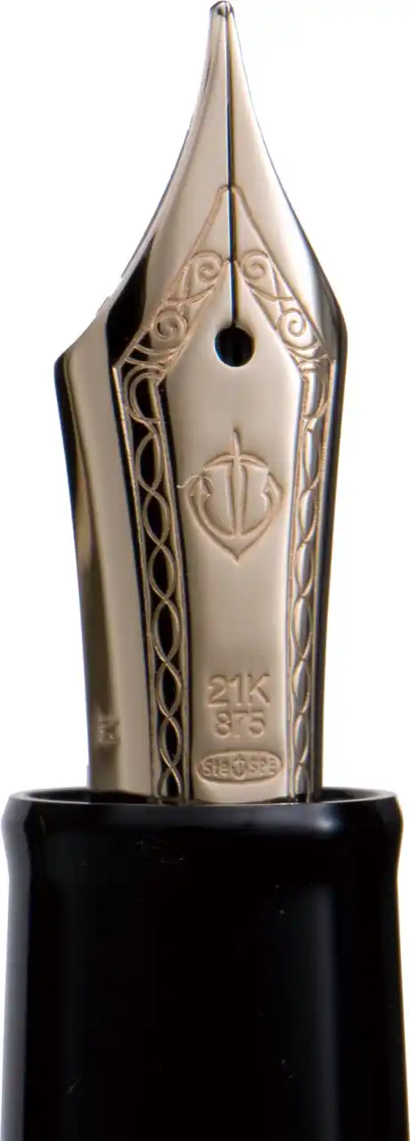 セーラー万年筆独自の技術で成し得た21金ペン先。万年筆のペン先として多く使われている14金や18金に比べて弾力をもたせており、筆圧が強くかかったときでもペン先の切れ込みが開くことなく、インク切れが起こりにくくなります。“しなる” ように紙面を滑り、常に安定したインク供給で“フェザータッチ” とも言われる快適な書き味が楽しめます。しなやかな書き心地を実現した、万年筆の原点が感じられる逸品です。 |