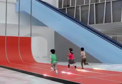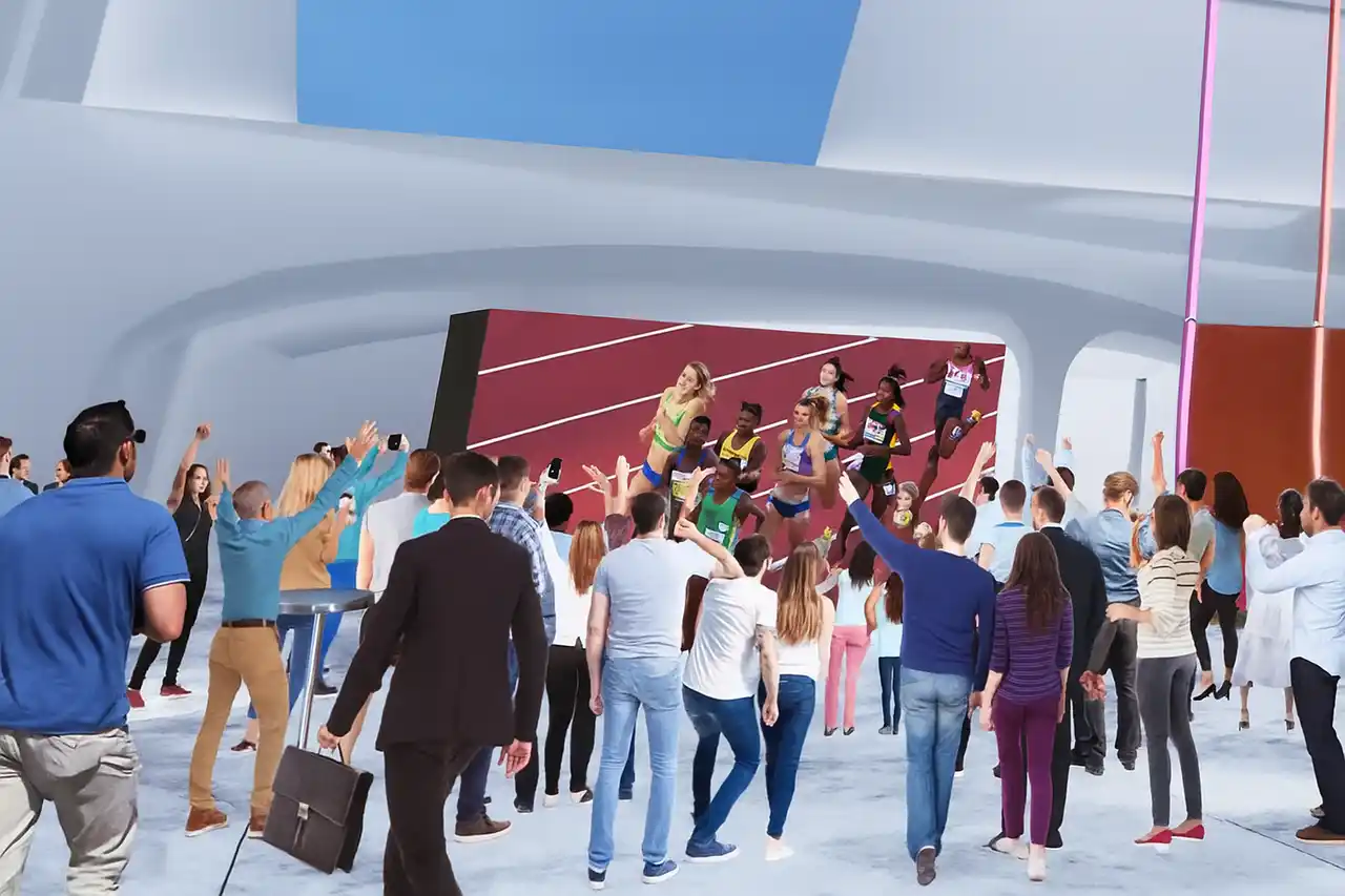| 会場内には、陸上トラックを設置。トラック上を走ると、その動きに連動してトラックのラインが光ります。「TOKYOの光を世界に届ける」をテーマに、上へと伸びる光は、TOKYOと世界を結ぶことを表現しました。 | ||||||||||||||