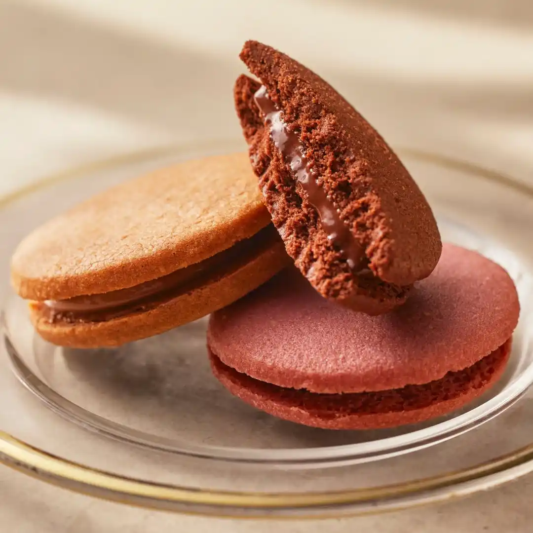 リンツのなめらかなチョコレートをバターの香り豊かなサブレでサンド。サクッと軽やかな食感のサブレの間から、はみ出すほど贅沢に挟んだ濃厚なチョコレートです。「カカオ 70%」「ミルク」「フランボワーズ」の3種類をご用意しました。ひと口頬張れば、サブレの香ばしさとともに、カカオの豊かな風味が口いっぱいに広がり、満足感あふれる一枚です。 |