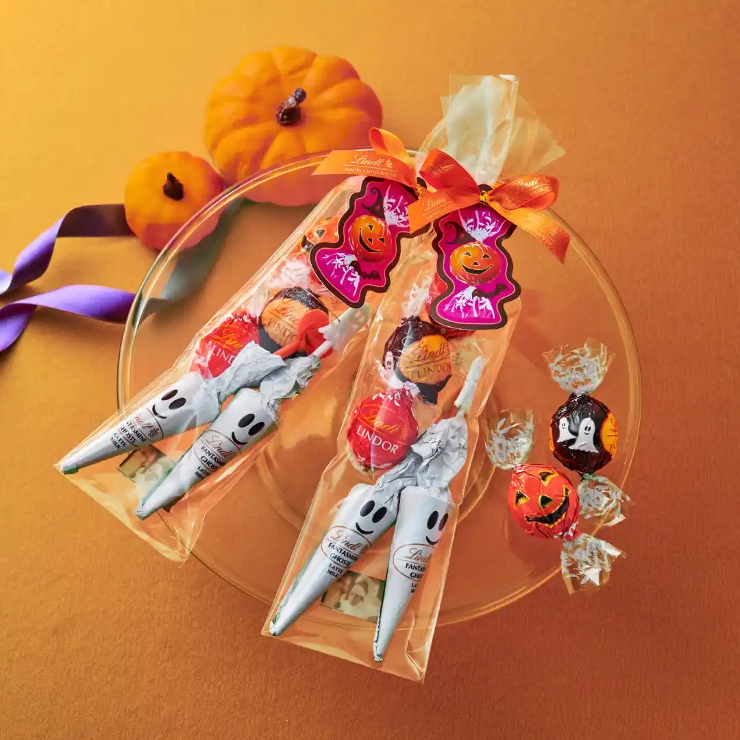 パープルにはゴーストの、オレンジにはパンプキンのデザインが可愛らしいアンブレラ型チョコレートがそれぞれ入った、ハンドル付きギフトバッグ。その他、期間限定リンドール「ハロウィン」「ゴースト」、人気フレーバーの「ミルク」「キャラメル」など6個のチョコレートを詰め合わせました。ちょっとした感謝を伝えたいときや、お子様への贈り物に喜ばれる一品です。 |