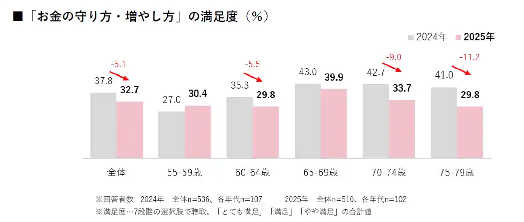 「お金の守り方・増やし方」の満足度は32.7%と昨年から5.1ポイント低下した。特に70代以上の低下が大きい。 |