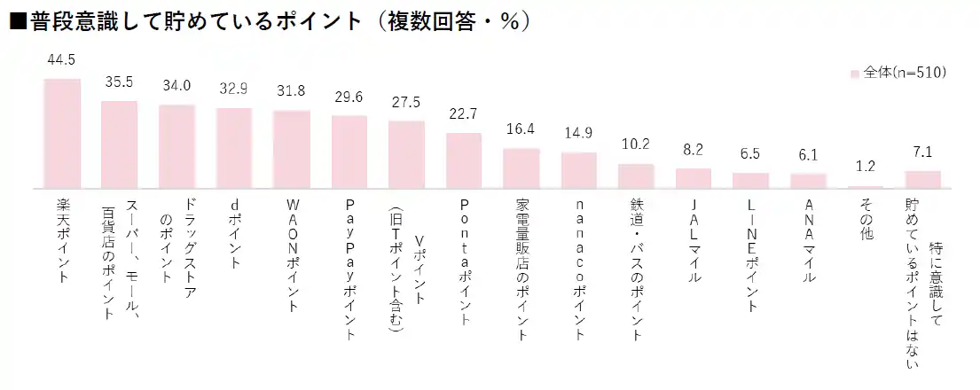 普段意識して貯めているポイントの1位は「楽天ポイント」で、唯一4割を超えた。9割以上が何らかのポイントを貯めている。 |