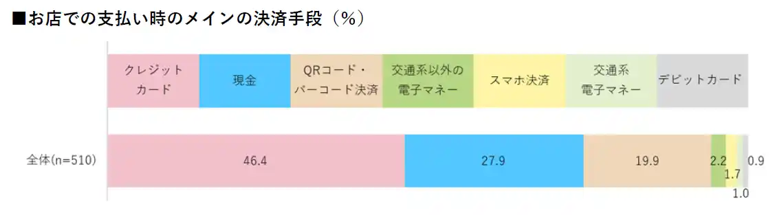 普段お店で支払う際のメインの決済手段は「クレジットカード」が46.4%で最多。「現金」27.9%を大きく上回った。 |