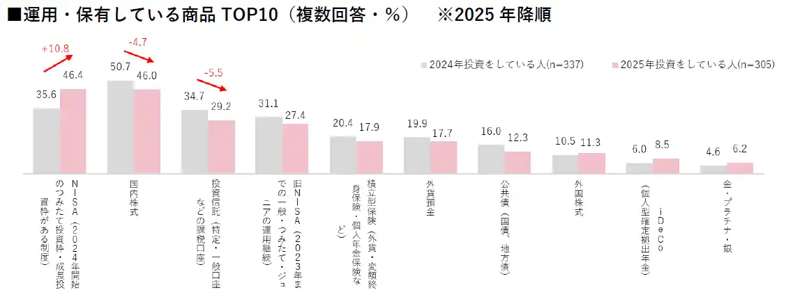 回答者のうち、投資をしているのは約6割で昨年と同程度。運用・保有している商品は「NISA」が最も高く、昨年から10.8ポイント増加。一方、「国内株式」「投資信託」は5ポイント前後低下した。 |