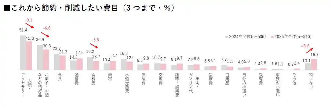 「これから節約・削減したい費目」の1位は昨年と同様「衣類・アクセサリー」だが、9.1ポイント低下。「お菓子・お酒などの嗜好品」「食料品」も低下し、「特にない」が増加した。 |