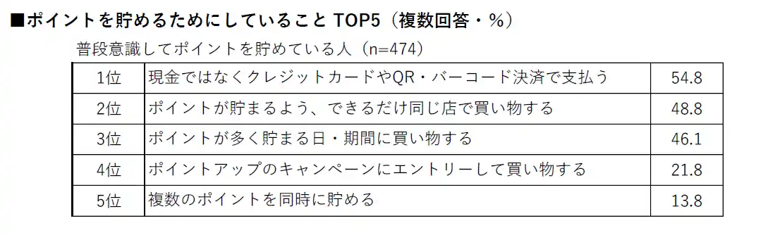 ポイントを貯めるためにしていることとして、「現金ではなくクレジットカードなどで支払う」が半数を超えたほか、「できるだけ同じ店で買い物する」「ポイントが多く貯まる日・期間に買い物する」などが挙がった。 |