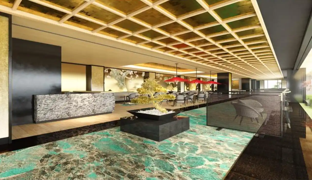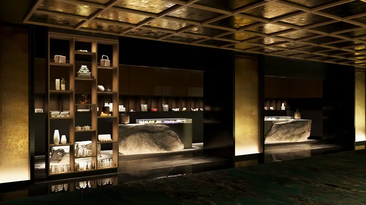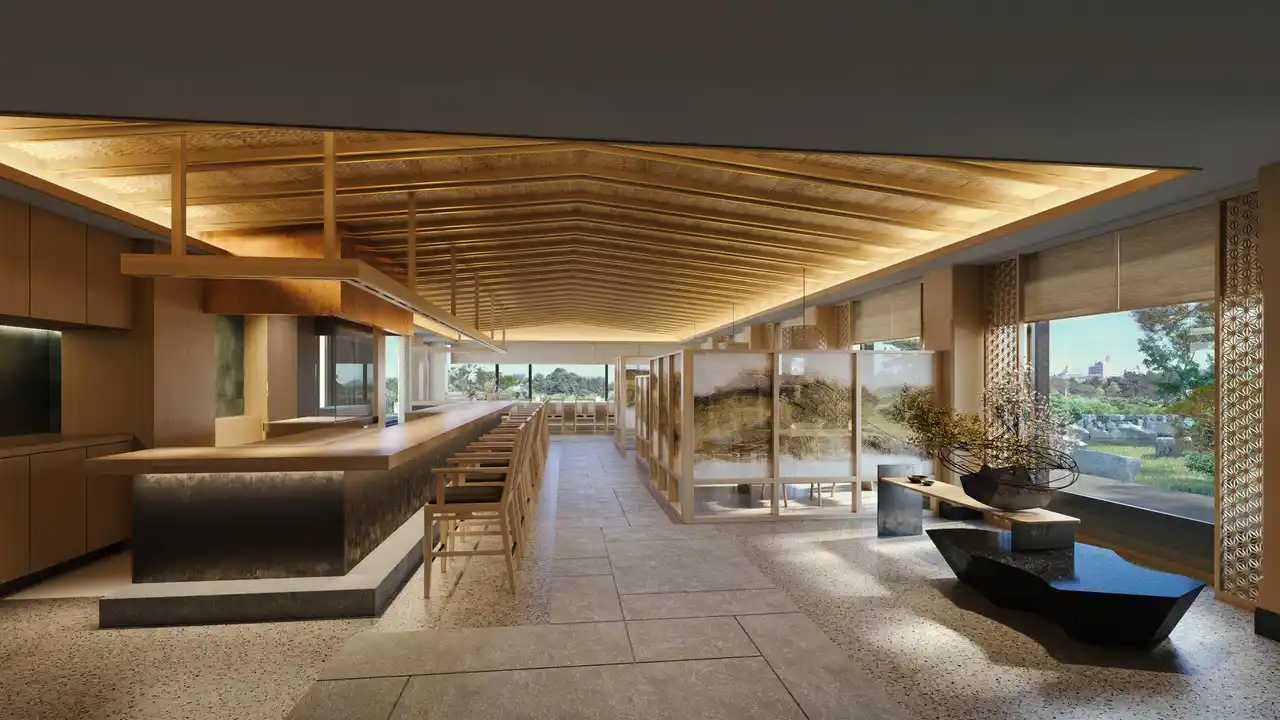 クラスの食体験を提供する多彩な8つのレストランを完成させます。メインエレベーターを4階で降りると、正面には黄金の松の木がそびえ立ち、借景には池泉庭園とその先に凛と佇む天守閣を望み、さらにレストランロビーはこれからのお食事のひとときへの期待感を高めます。