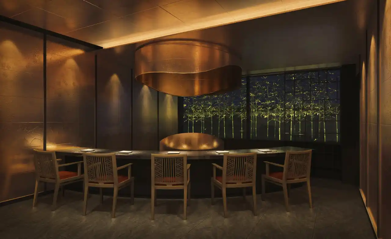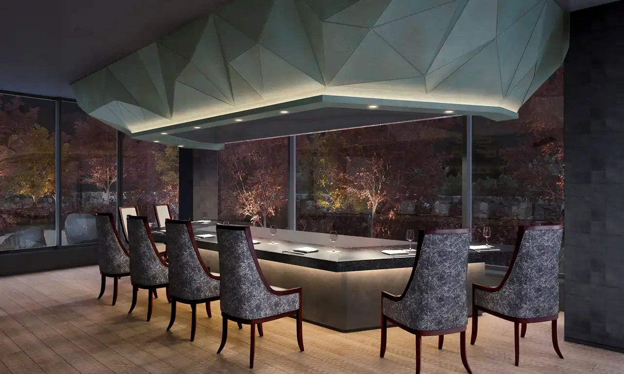 銀座や六本木、台湾などに店舗を展開し、鉄板料理ならではのライブ感と心を込めたおもてなしでゲストを魅了する「うかい亭」。名古屋城を一望するラグジュアリーな空間を、折り紙をテーマにした日本の伝統美と西洋アートが融合したインテリアで彩りました。 |