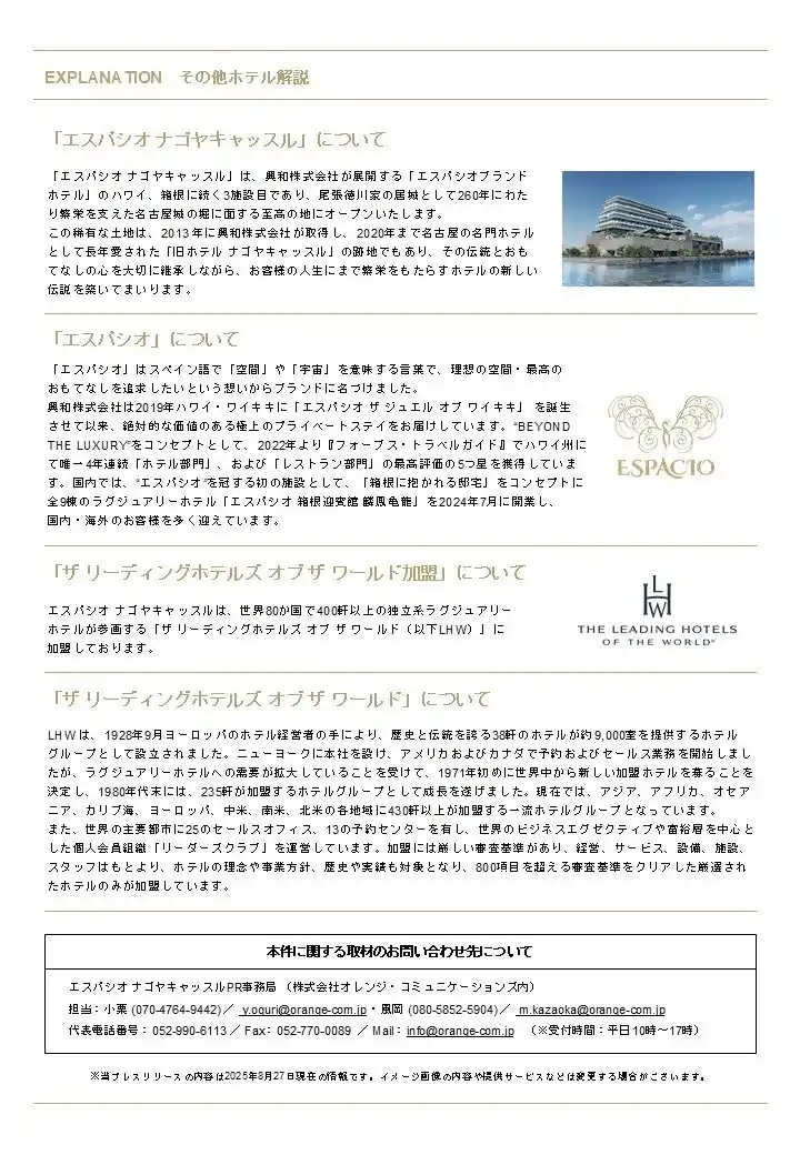 「エスパシオ ナゴヤキャッスル」(所在地:名古屋市西区樋の口町3番19号)は、2025年9月1日(月)より、ホテル公式サイト(https://www.espacionagoya.com/)にてホテル館内8つのレストラン、および館内のスパトリートメントの予約受付を開始することをお知らせいたします。 |
