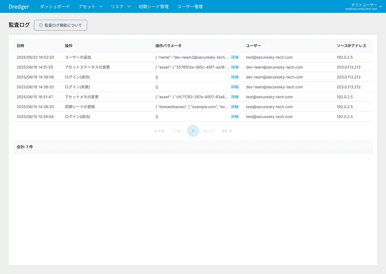 ● 監査ログ機能 Dredger上におけるユーザー操作のログが記録される監査ログ機能を追加しました。今回のリリースでは、認証、ユーザー管理、初期シード管理、アセット管理に関連する操作が監査ログの記録対象です。今後も対象操作を順次拡大予定です。 |