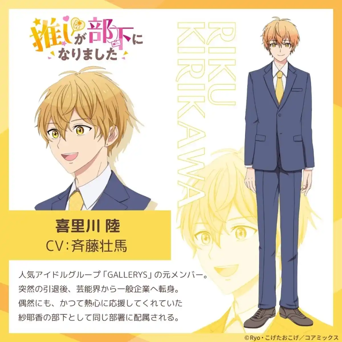 本作の注目ポイントは、元アイドルの新入社員“陸”を人気声優・斉藤壮馬さんが演じることです。「もし自分の推しが部下になったら…?」という誰もが一度は夢見るような設定を、アニメらしいテンポと臨場感で描きます。 |