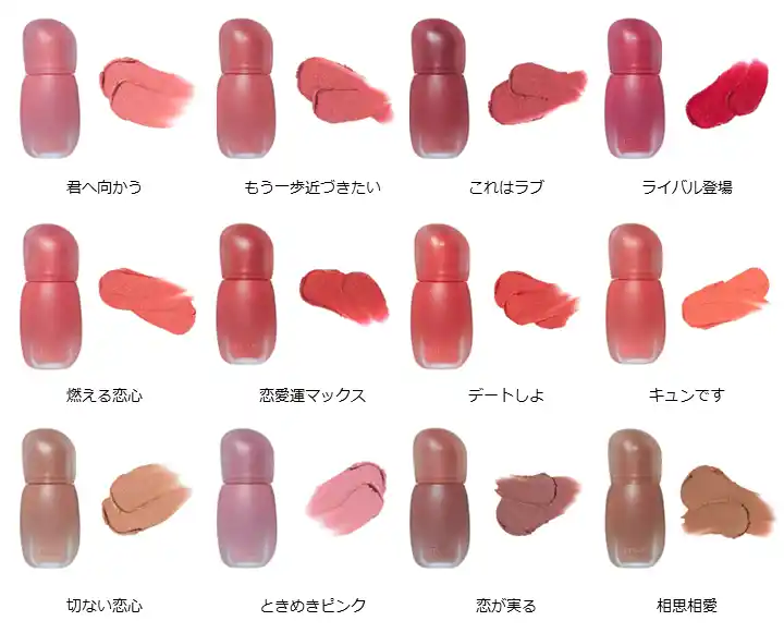 なめらかな塗り心地と、パサつきのない仕上がりを持ち合わせたリップなので、リップカラーとしてはもちろん、チークとしても使えるマルチユースな使用感。曖昧くすみカラーから、ビビッドカラー、大人っぽい落ち着いたカラーまで多彩なバリエーションで毎日のリップメイクにトキメキを与えます。 |