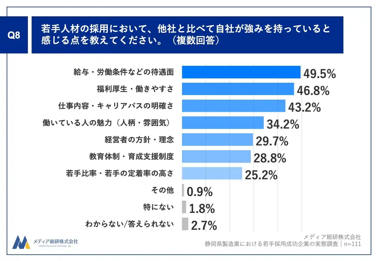「Q8.若手人材の採用において、他社と比べて自社が強みを持っていると感じる点を教えてください。(複数回答)」