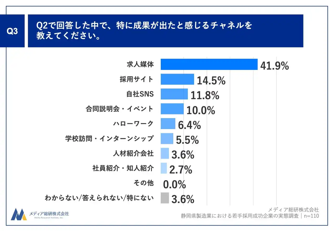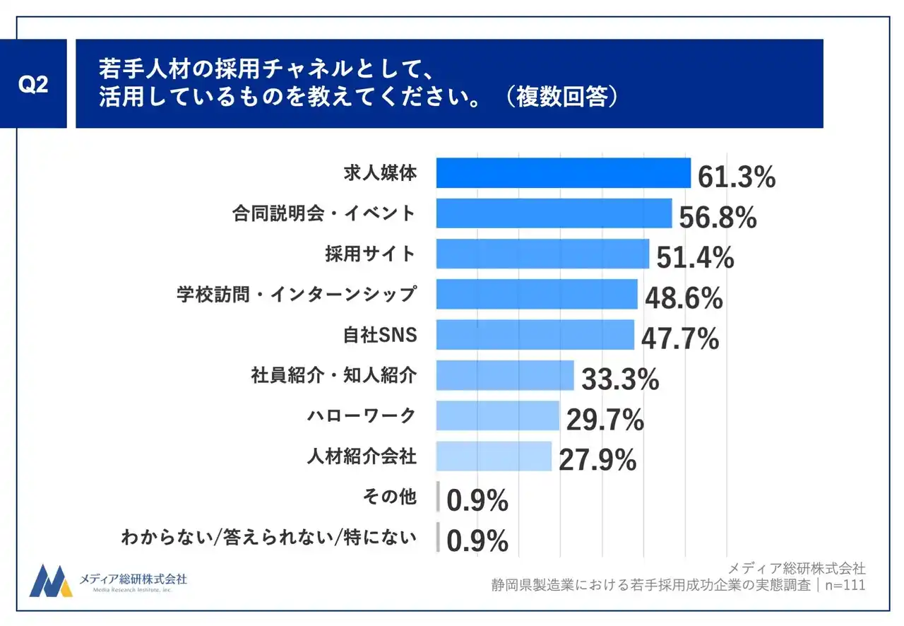 企業と学生をつなぐ多様なサービスを提供する、メディア総研株式会社(本社:福岡県福岡市、代表取締役社長:田中 浩二)は、静岡県内に若手採用を行っている拠点(本社・工場・営業所など)を有し、採用に成功している(過去3年間で30歳以下の正社員を20名以上採用した)製造業企業の採用担当者111名を対象に、静岡県製造業における若手採用成功企業の実態調査を実施しましたので、お知らせいたします。