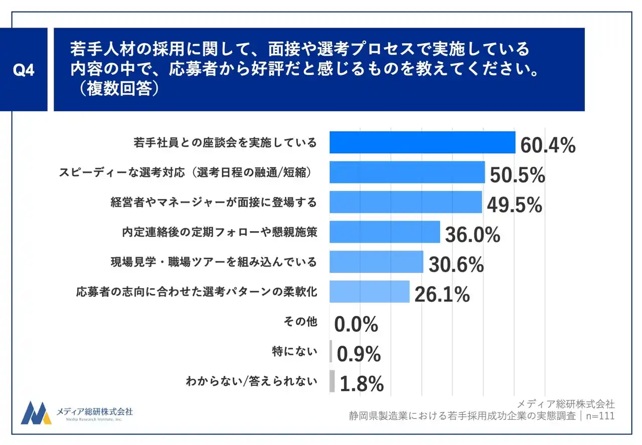 Q4.若手人材の採用に関して、面接や選考プロセスで実施している内容の中で、応募者から好評だと感じるものを教えてください。(複数回答) |