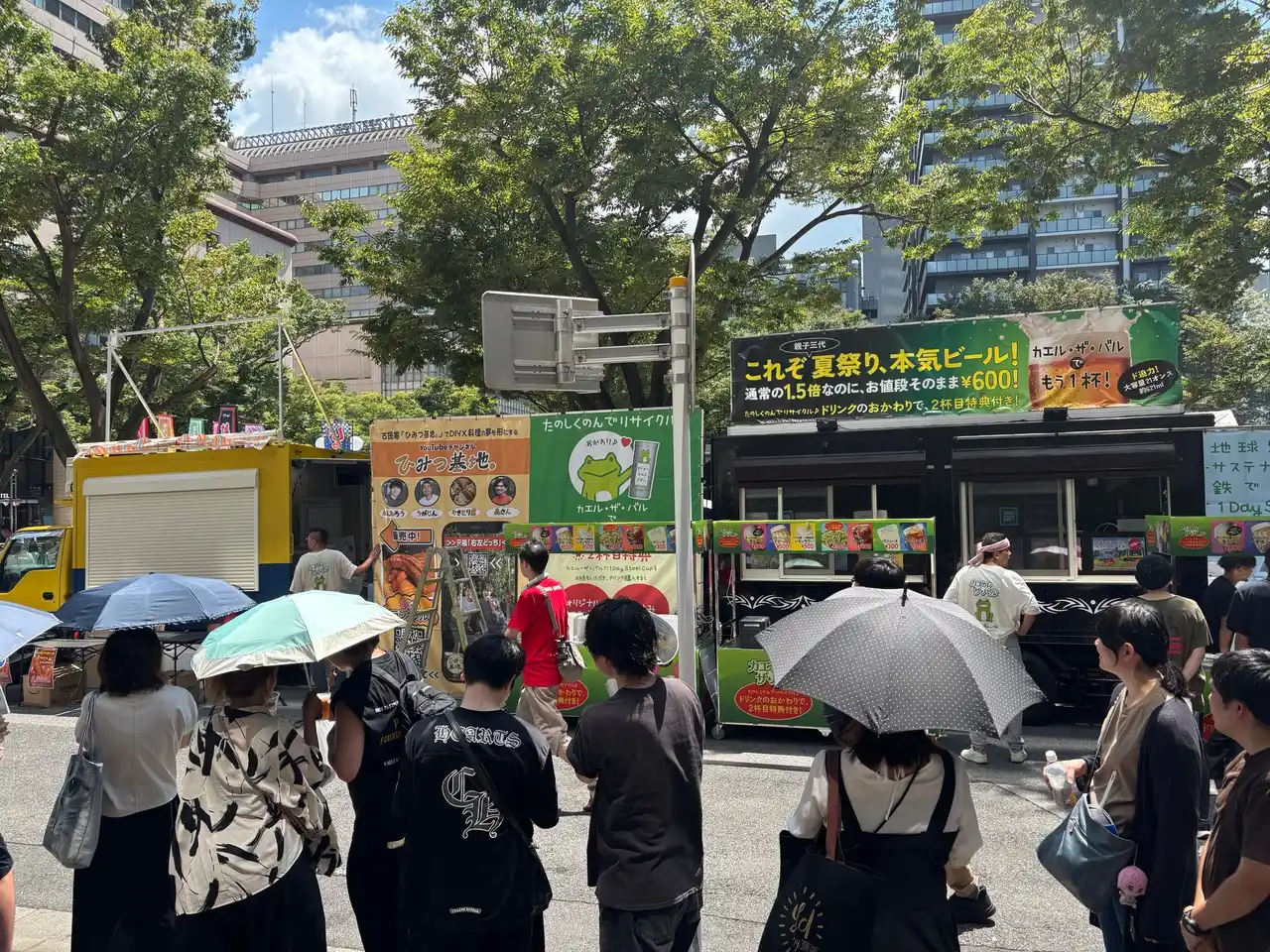 | 本取り組みは、イベント向けスチール製容器「1Day Steel Cup(ワンデー・スチール・カップ)」を多くの方に体験してもらうことを目的に、千葉の夏の風物詩である「第 50 回千葉の親子三代夏祭り」の本祭りにオリジナルキッチンカー(店名:カエル・ザ・バル)を出店しました。 | ||||||||||||||