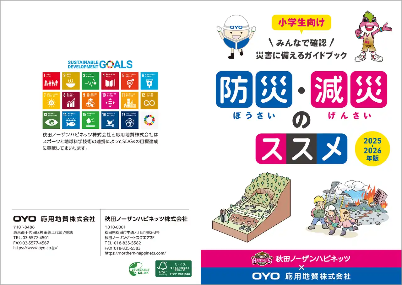 地盤・地質リスクの最前線を可視化する応用地質株式会社(本社:東京都千代田区、代表取締役社長:天野洋文)は、SDGsパートナーである秋田県をホームとするプロバスケットボールクラブ、秋田ノーザンハピネッツさまと協力し、子どもたちの防災学習を通じて地域全体の防災意識向上に貢献することを目的に、防災ガイドブック『防災・減災のススメ(小学生版)』および『防災カード』を制作しました。2025年8月26日(火)秋田県庁にて、県内の小学生に向けて約7,500部を寄贈いたしました。また9月には、秋田市内の小学校を訪問し、防災授業を実施する予定です。 |