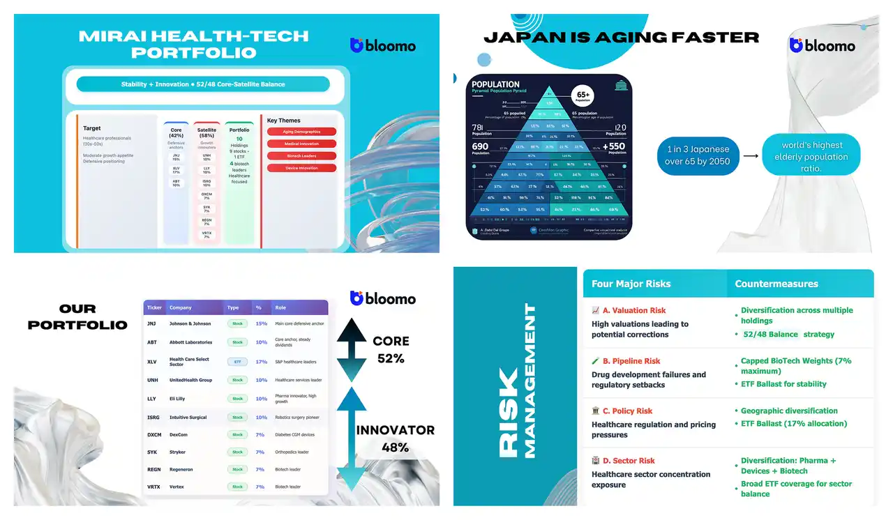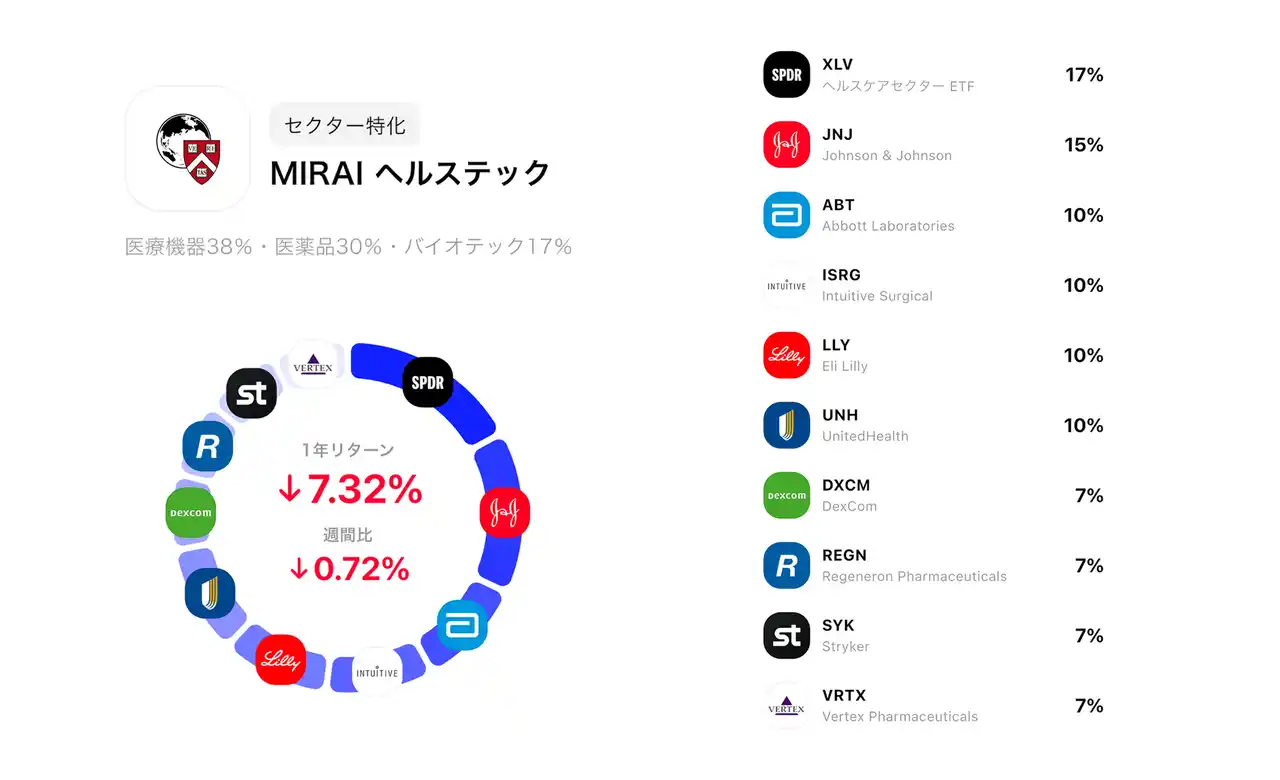 | ヘルスケアセクターの中で、配当率の高い安定銘柄や分散型のETFを約半分、残りの半分を成長性の高いヘルステック銘柄に割り当て、成長と安定のバランスをとっています。 | |||