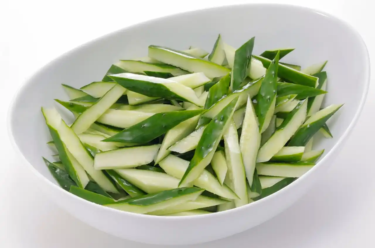 水っぽくなるのを防ぐためきゅうりの種を取り除くようにカット。パリパリとした食感が楽しい野菜です。 |