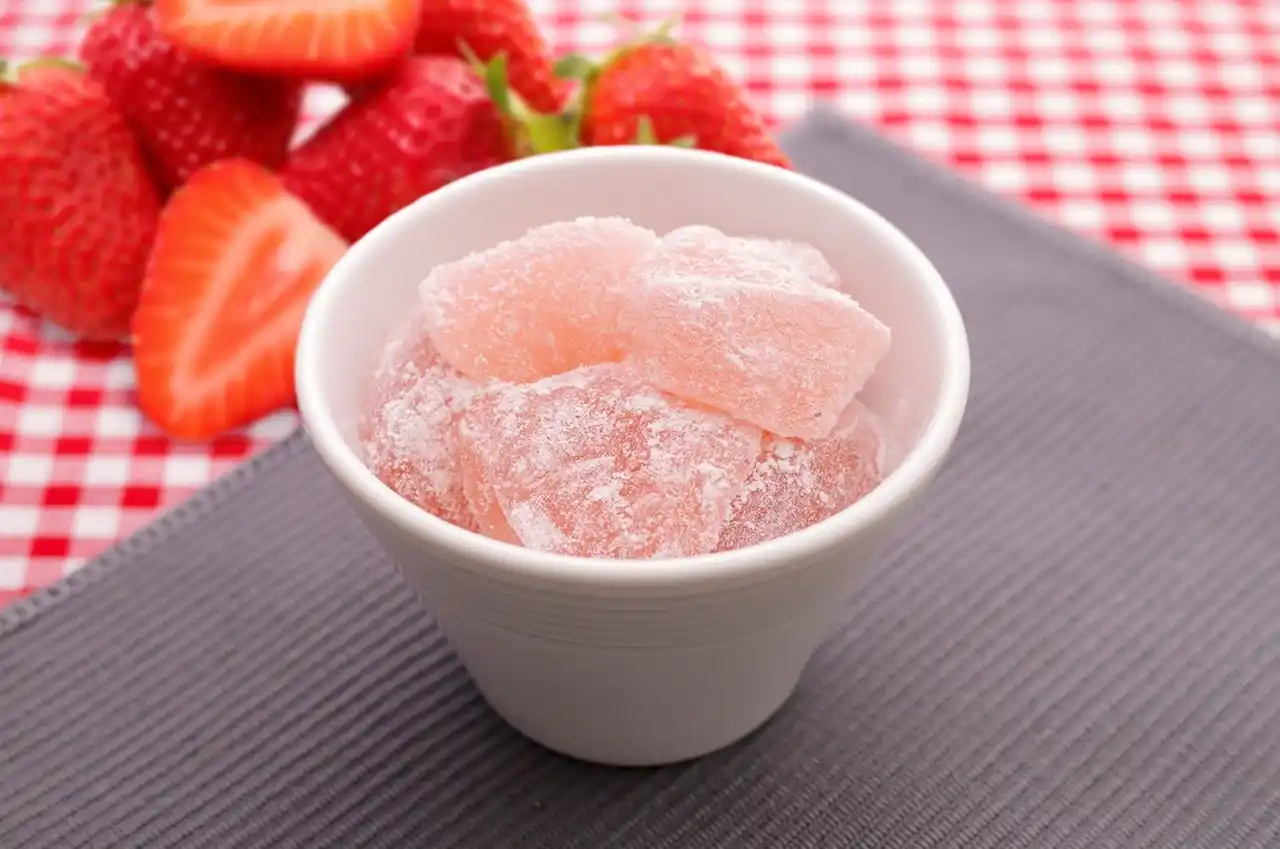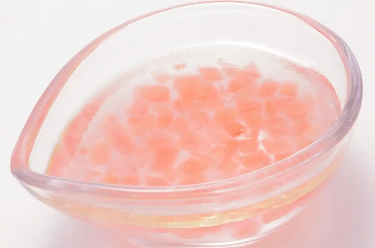 ほのかないちごの風味が感じられる、ピンクの可愛らしいわらびもちです。 |