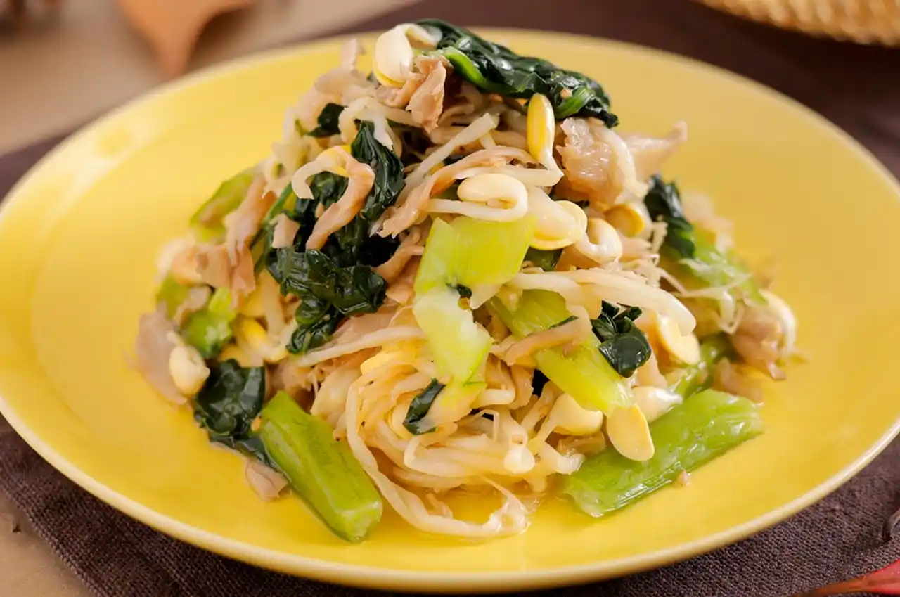 秋が旬の舞茸を豆もやしと小松菜と合わせてナムルに仕立てました。ごま油の風味が食欲をそそります。 |
