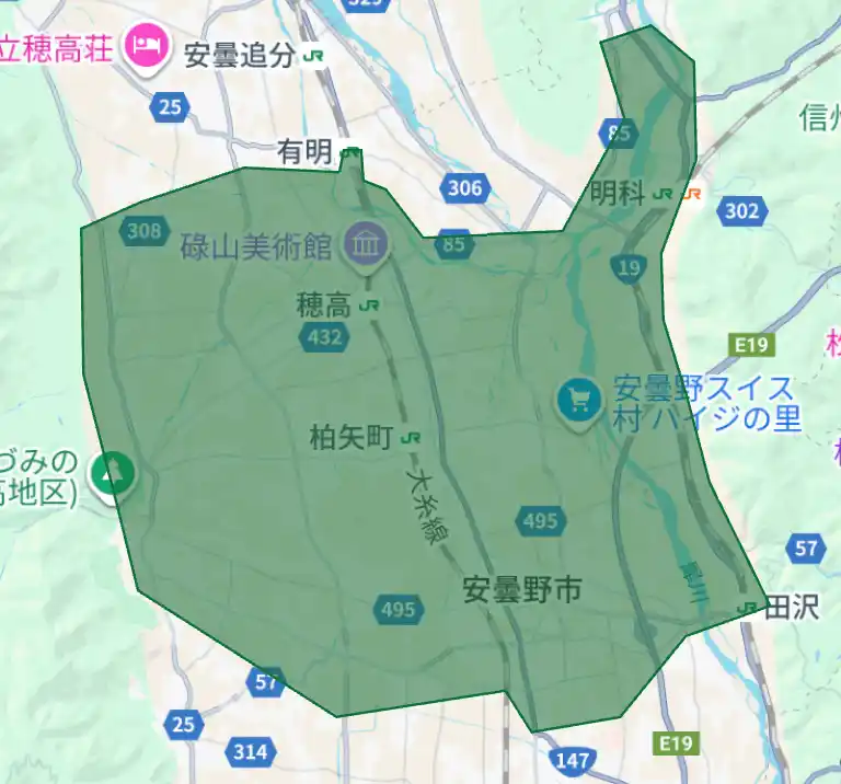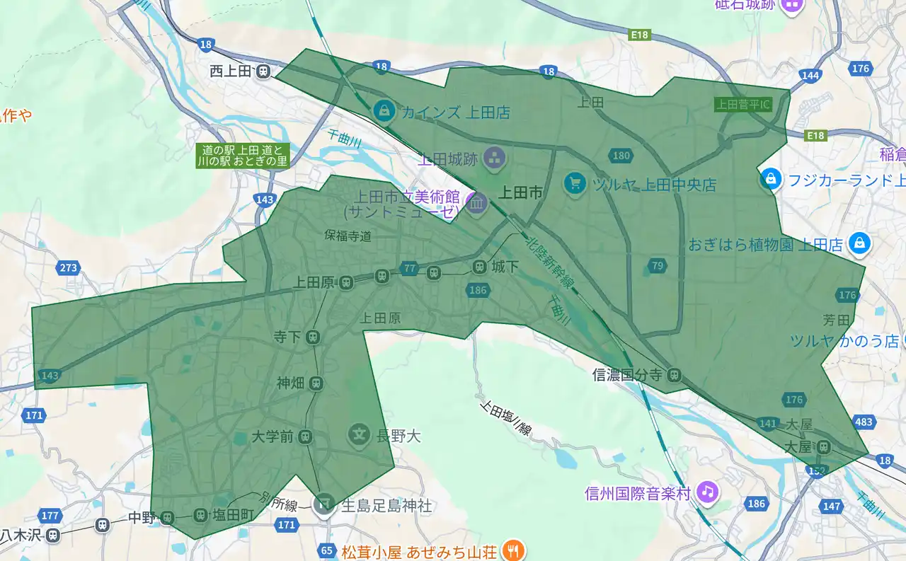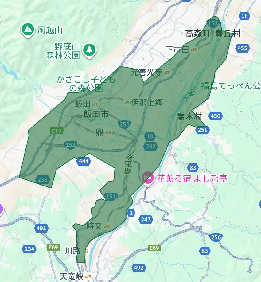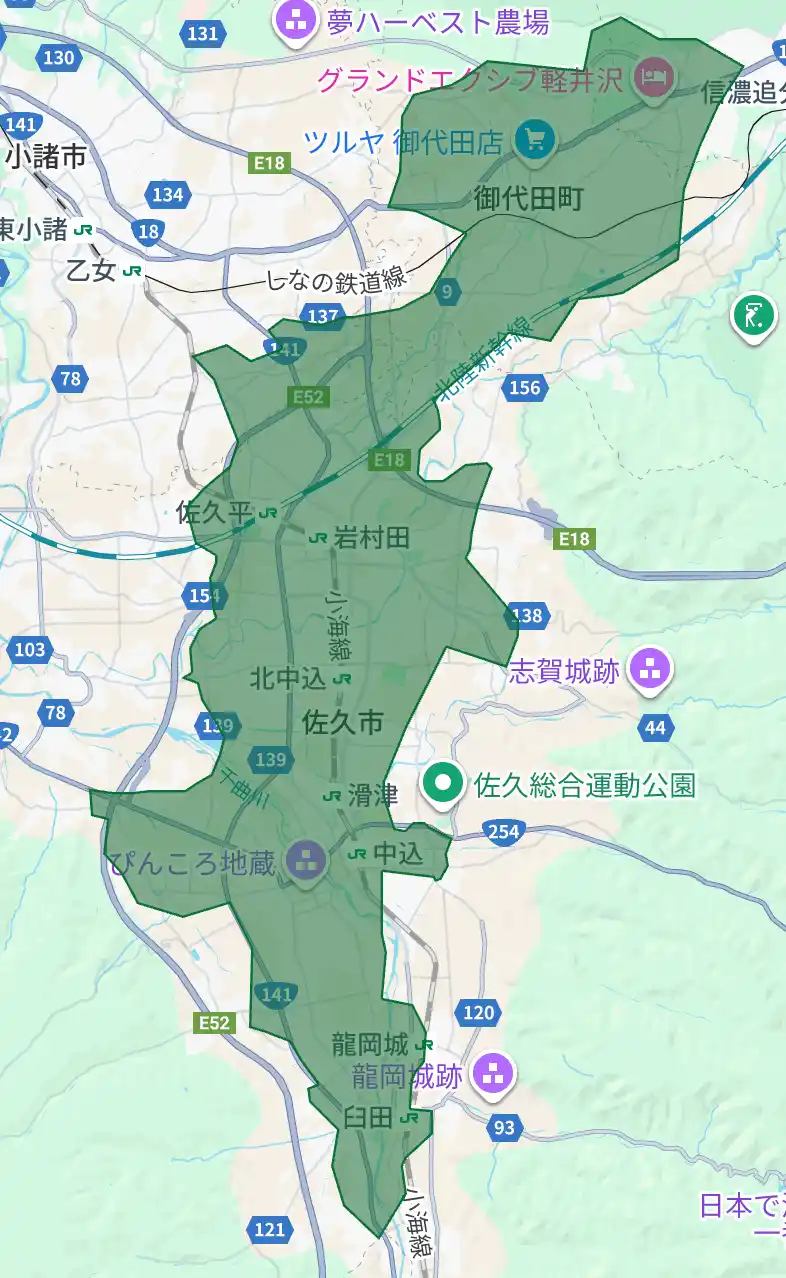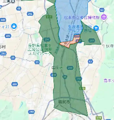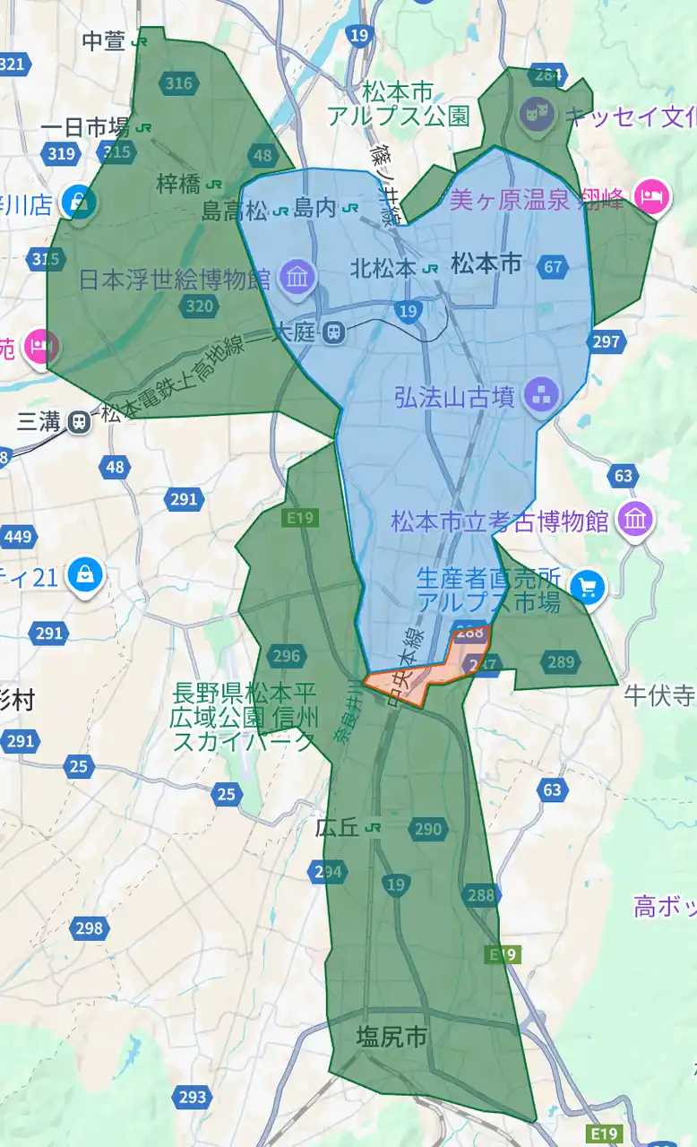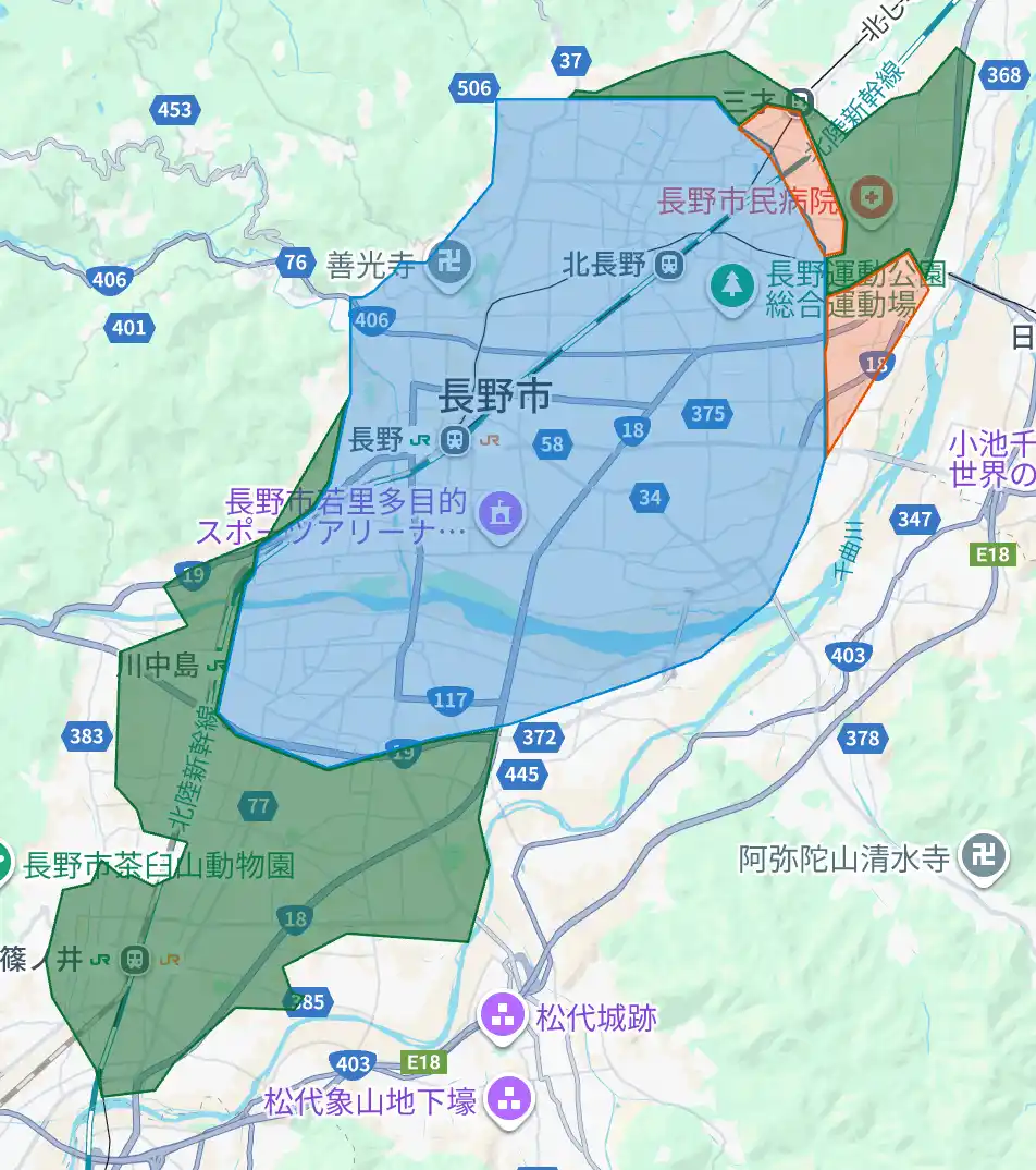 長野県:佐久市(御代田町含む)、上田市、飯田市、塩尻市、安曇野市(緑色部分。青色・赤色部分は既存提供エリア) |