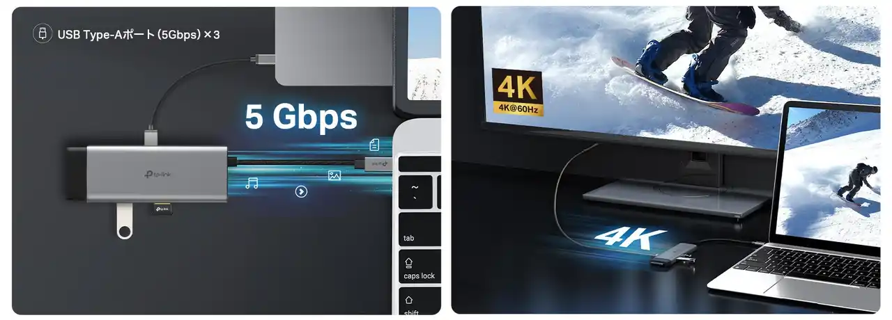 「UH7021C」は、最大5Gbpsの高速データ転送(USB 3.0)に対応し、容量の大きなファイルもスムーズに転送可能。さらに、HDMIポートは4K@60Hzに対応しており、外部ディスプレイに高精細な映像を出力できます。 |