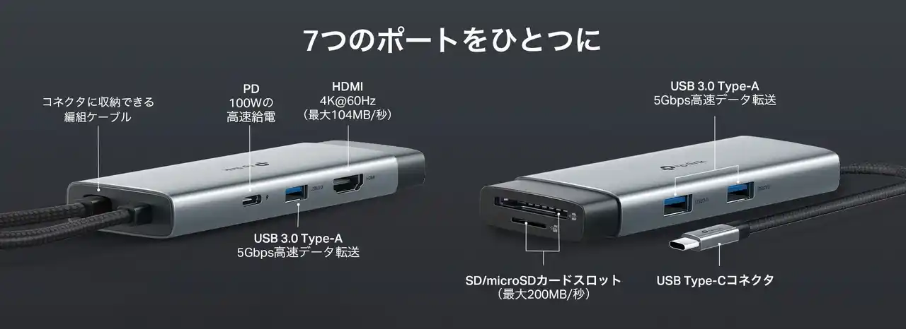 7つのポートを一つに:4K 60Hz対応*1のHDMIポート、SD&microSDカードスロットなど、7つのポートが1つのハブに |