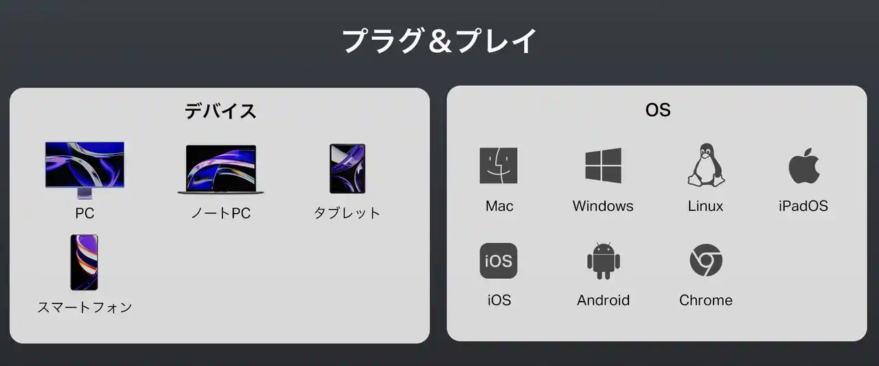 プラグ&プレイ:Windows、macOS、iOS、AndroidなどさまざまなOSに対応し、プラグ&プレイで作業をスタート*3